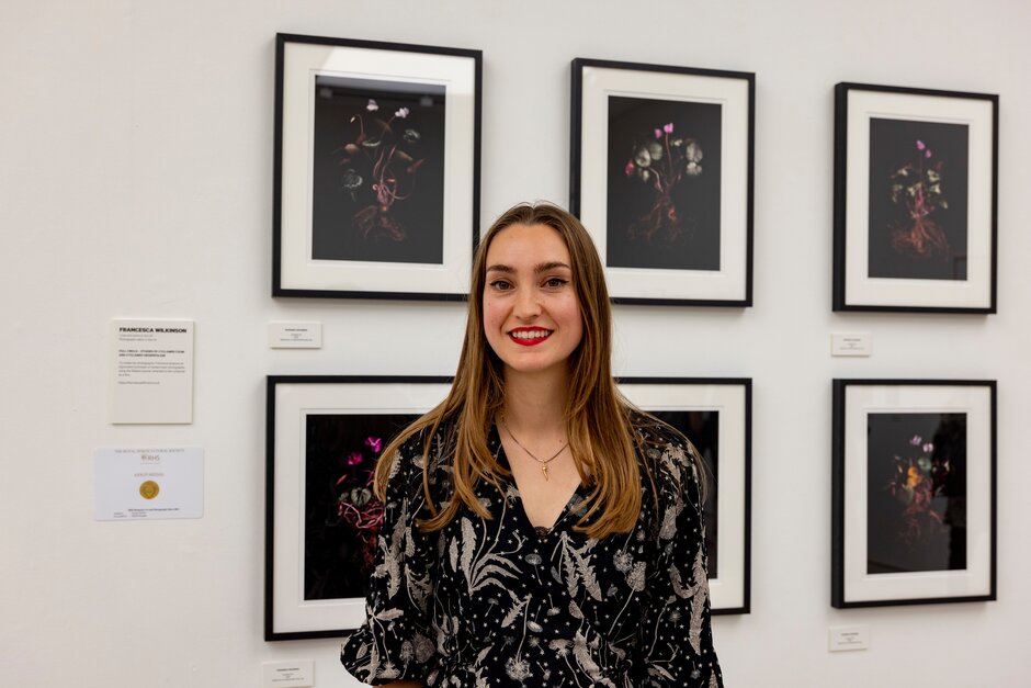 Francesca Wilkinson with her entry “Full Circle Studies of Cyclamen coum and Cyclamen hederifolium”